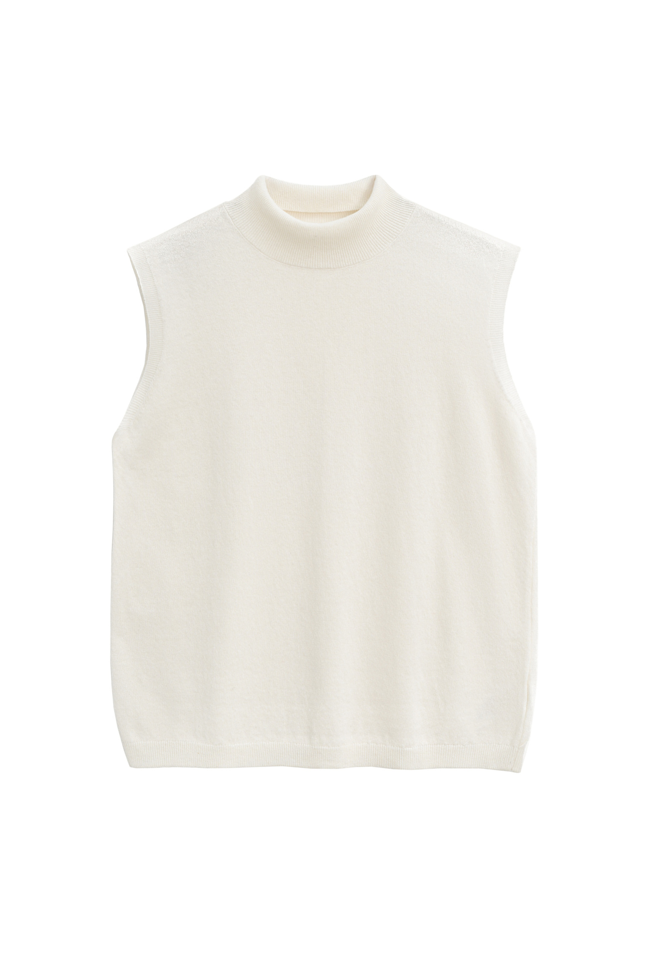 Трикотажный жилет из кашемира и шерсти. Модель без рукавов с воротником-стойкой, выполненным в тонкий рубчик.