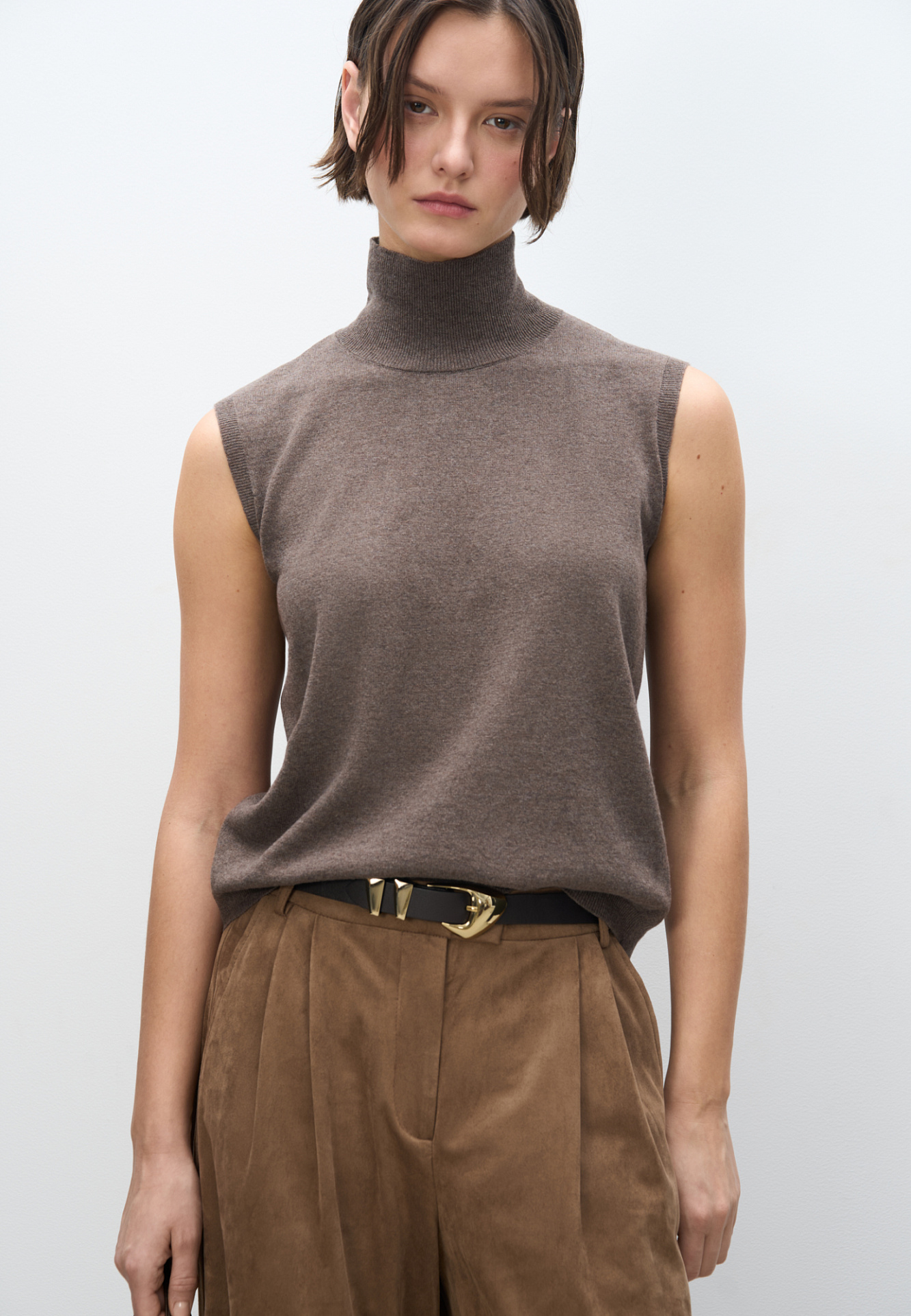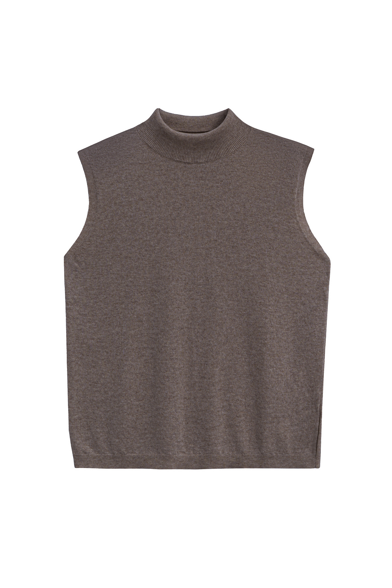Трикотажный жилет из кашемира и шерсти. Модель без рукавов с воротником-стойкой, выполненным в тонкий рубчик.