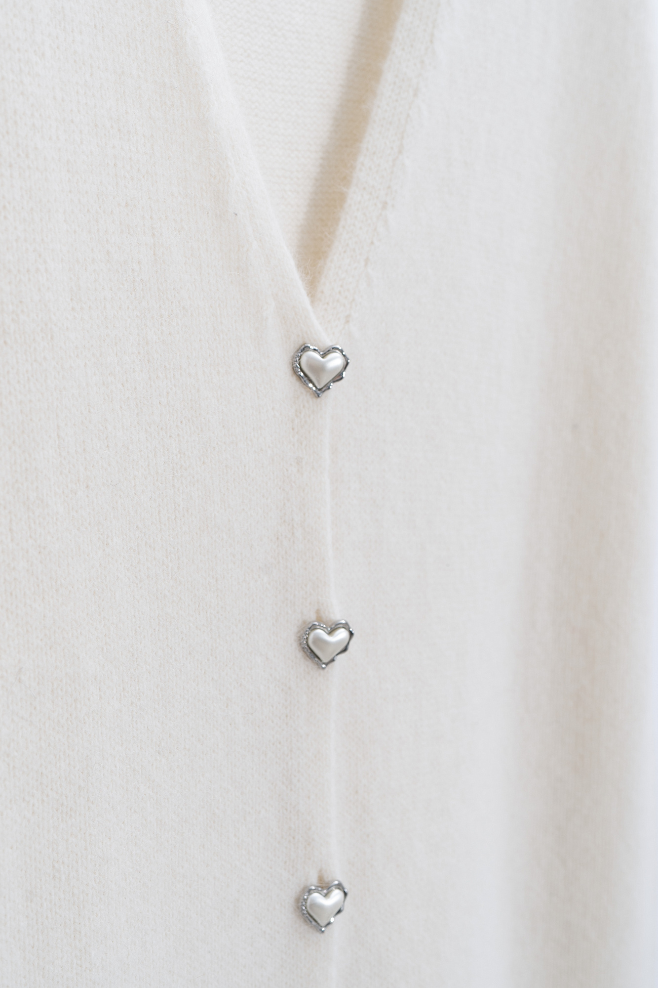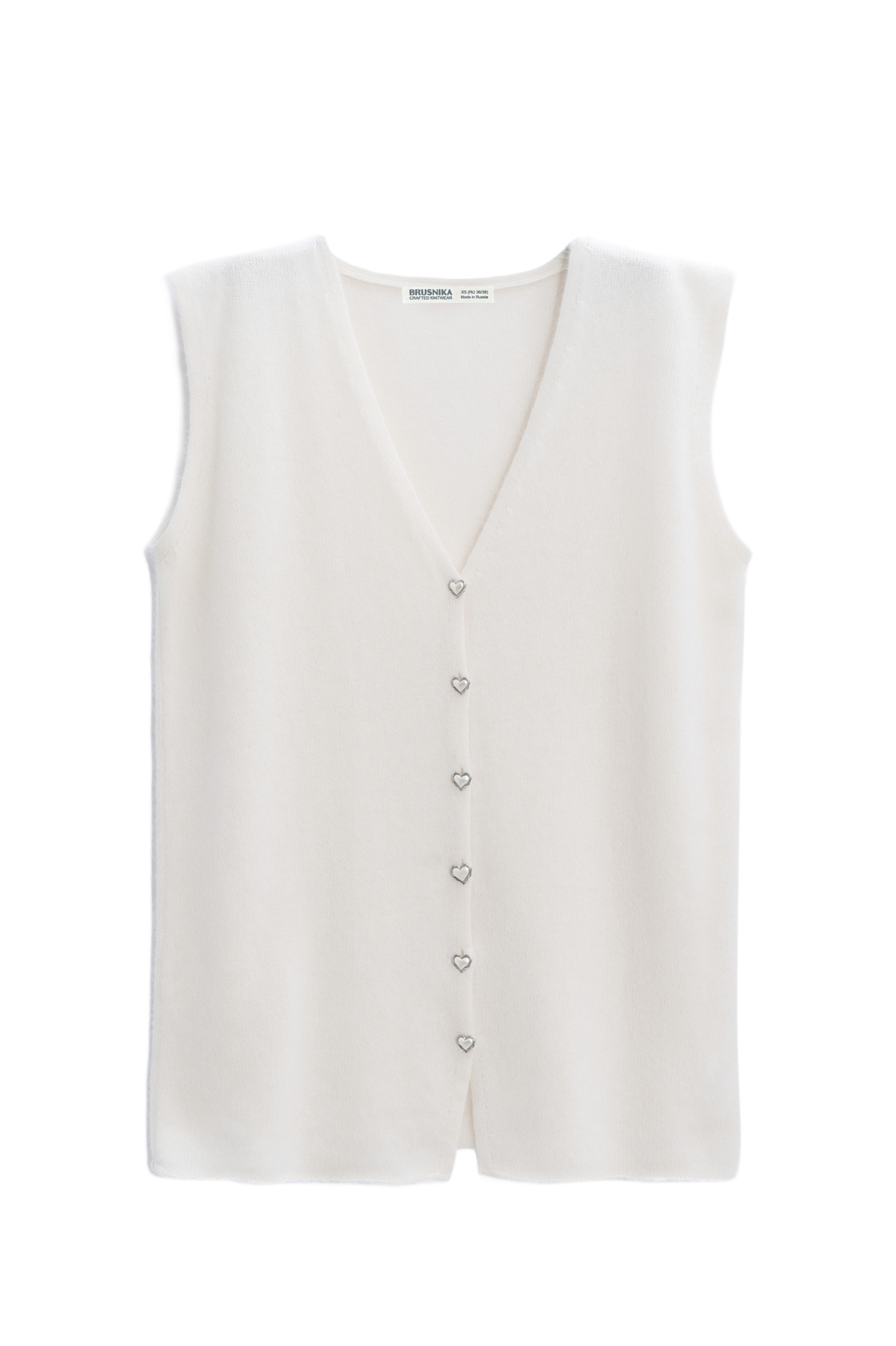 Трикотажный жилет из шерсти и пуха лисы. Модель удлиненного силуэта с V-образным вырезом горловины и застежкой на пуговицы-сердечки.