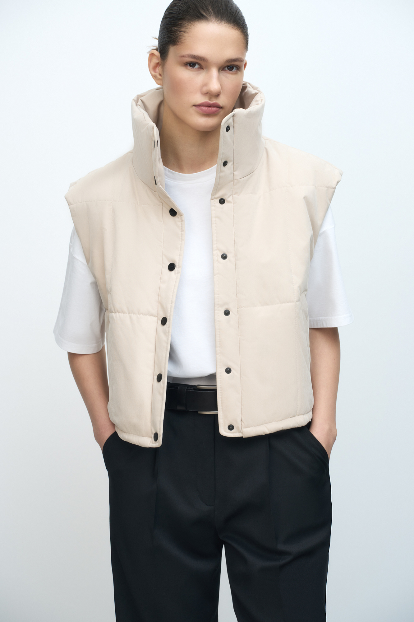 Утепленный жилет с воротником-стойкой. Модель приталенного силуэта с застежкой на кнопки.