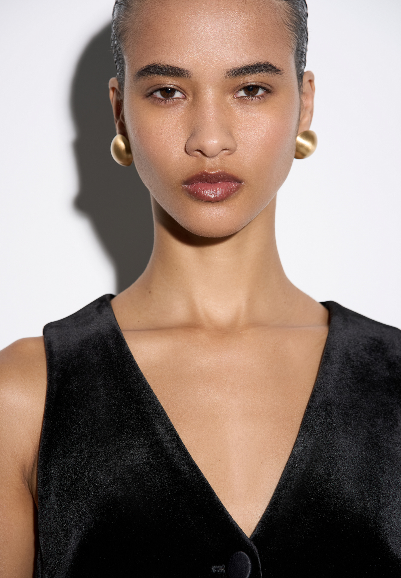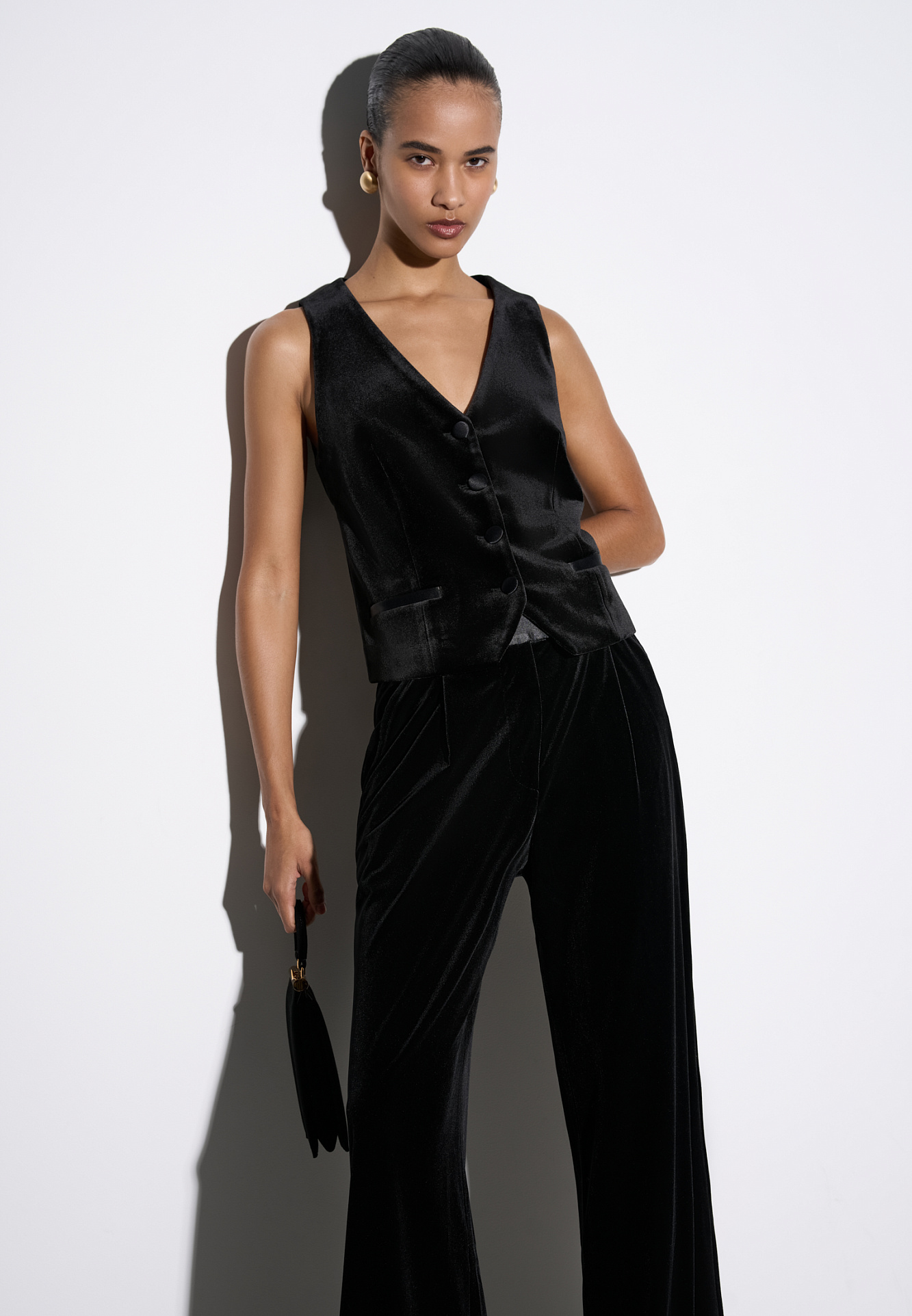Приталенный однобортный жилет из бархата с декоративными прорезными карманами, глубоким V-образным вырезом и заостренными нижними краями. Застегивается на пуговицы.