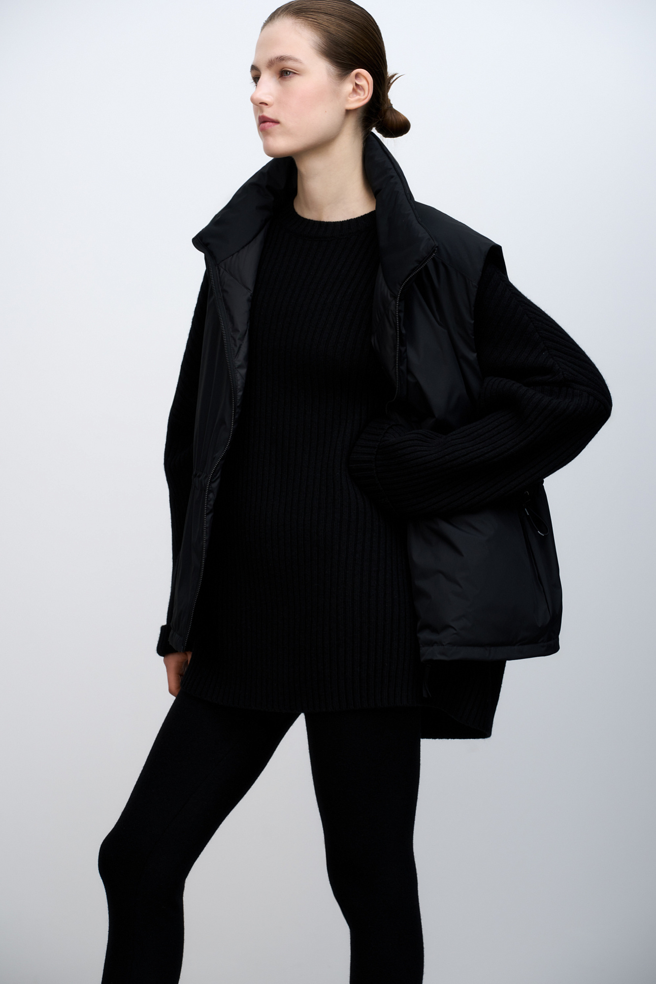 Жилет на пуху с регулируемой кулиской на талии. Модель свободного силуэта с воротником-стойкой и застежкой на молнию.