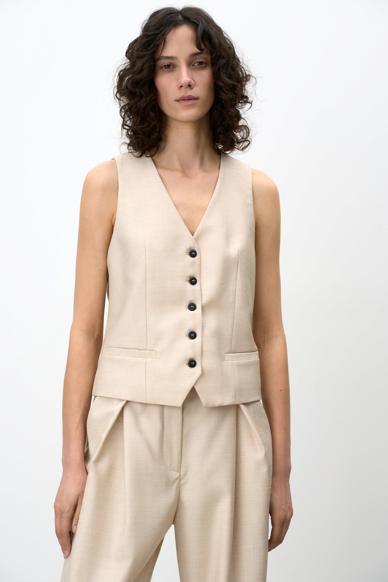 Классический жилет из шерсти с текстурой. Модель прямого кроя с V-образным вырезом и имитацией карманов. Застежка на пуговицы. Дополнить образ можно жакетом и брюками в таком же стиле.
