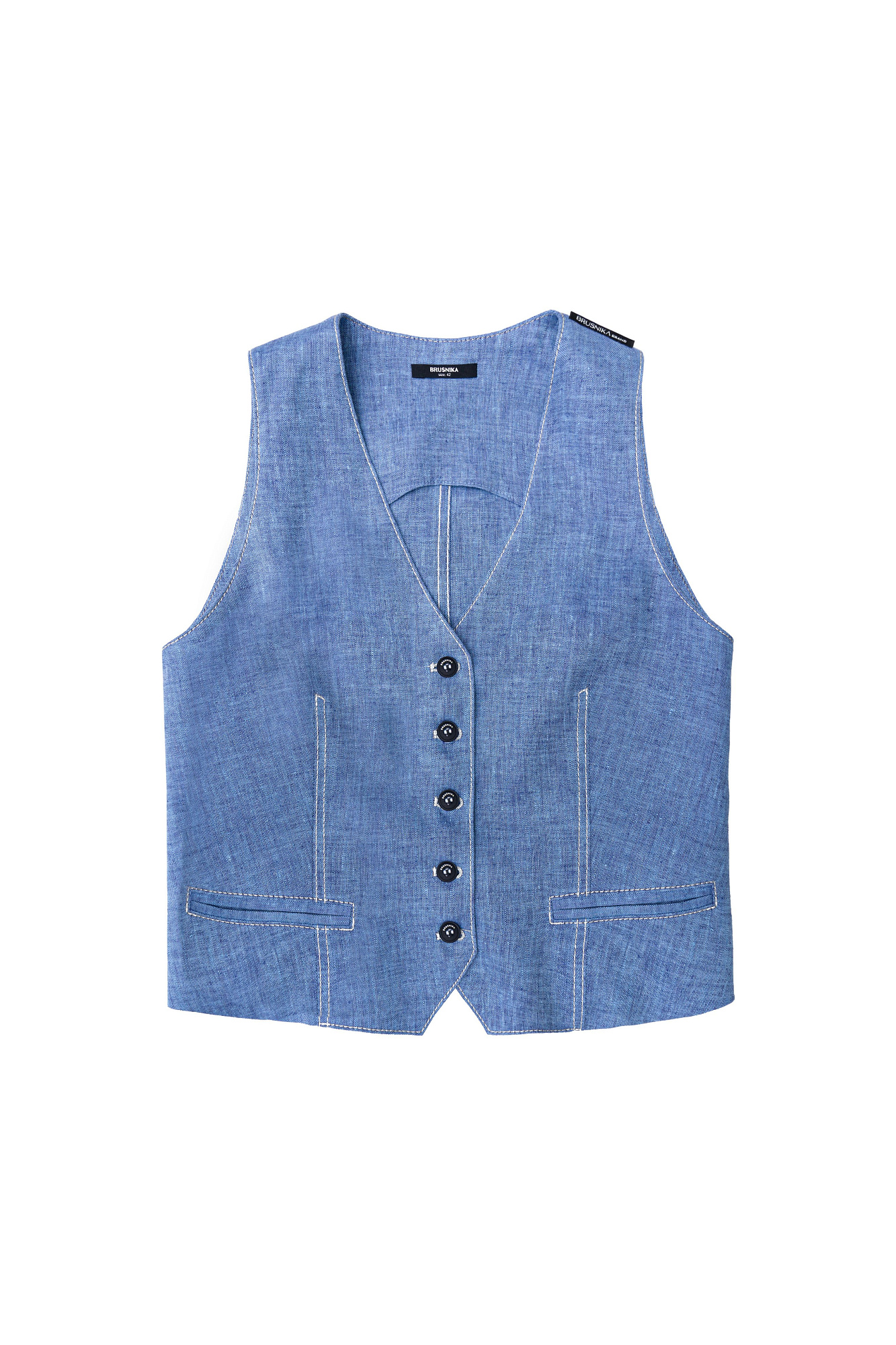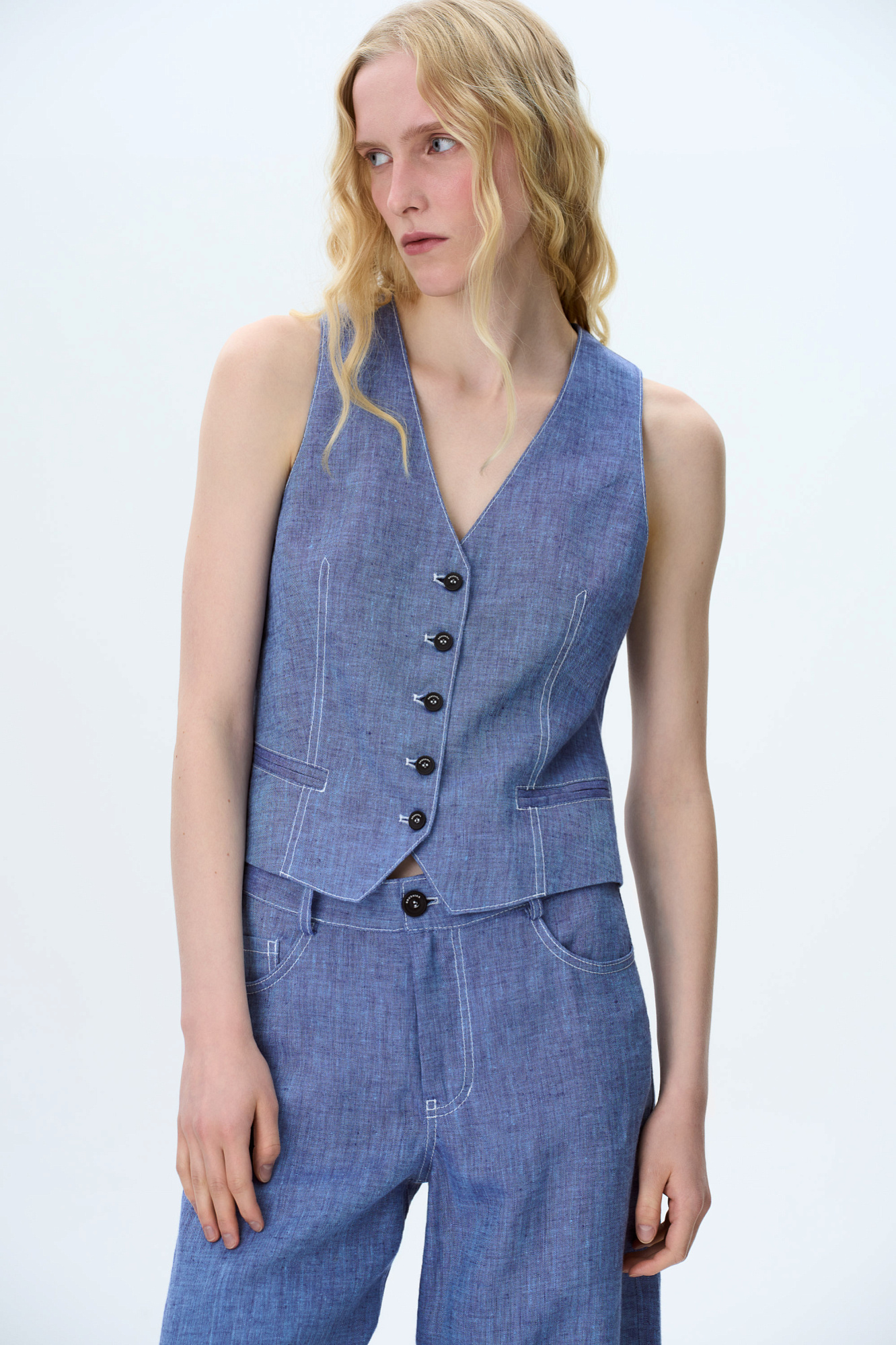 Жилет изо льна. Модель прямого кроя с V-образным вырезом и имитацией карманов. Застежка на пуговицы. Дополнить образ можно джинсами в таком же стиле.