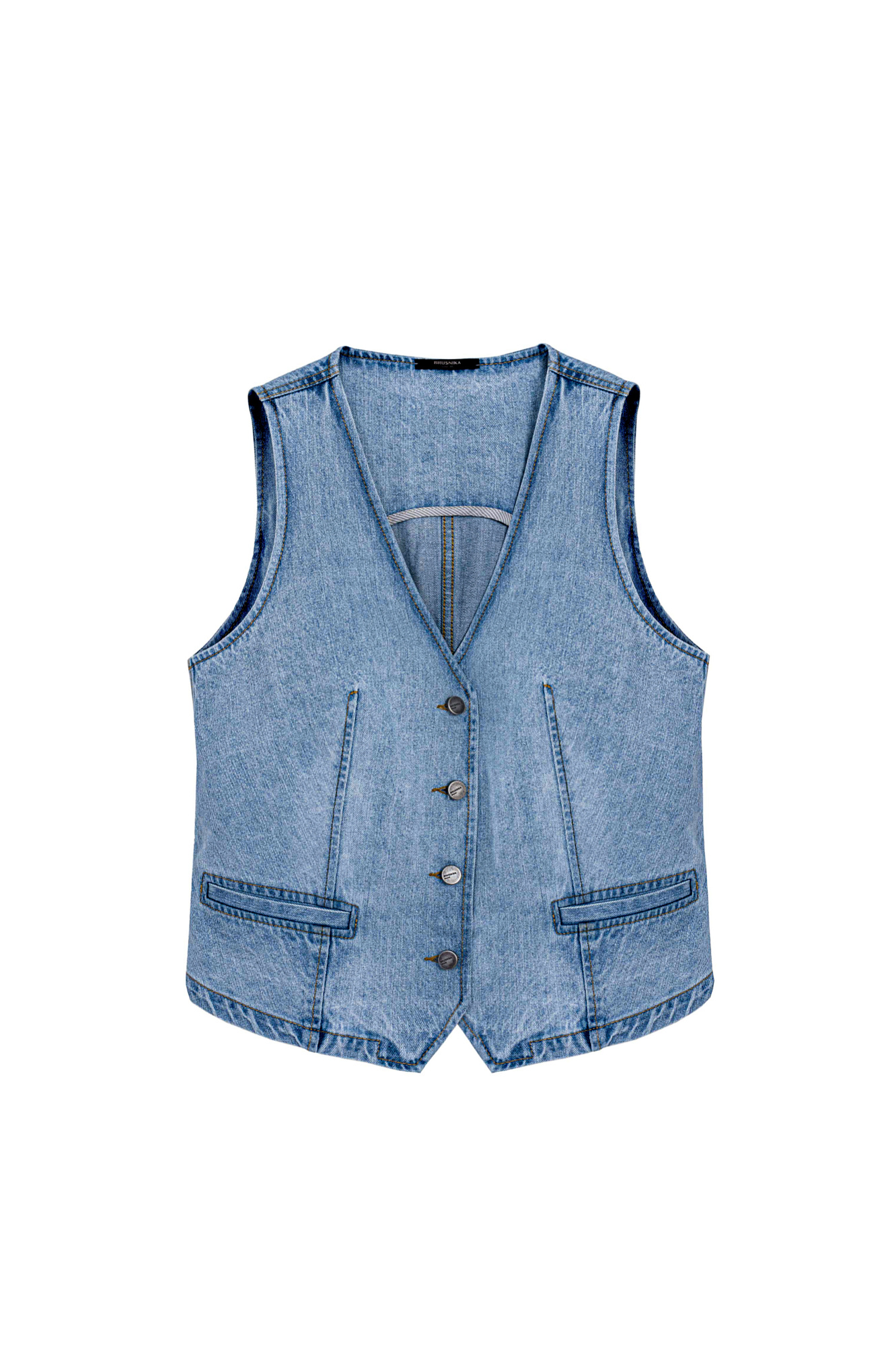 Джинсовый жилет. Модель прямого кроя с V-образным вырезом и имитацией карманов. Застежка на пуговицы.