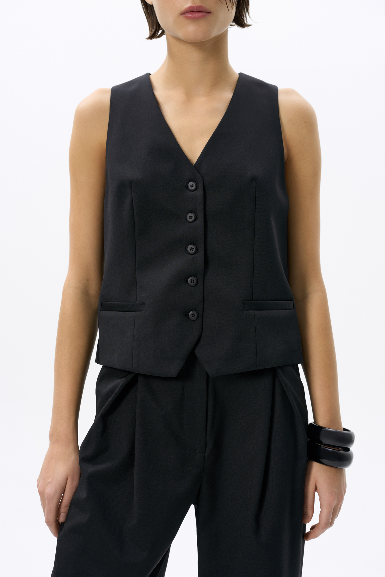 Классический жилет с имитацией карманов и v-образным вырезом. Застежка на пуговицы. Без подкладки.