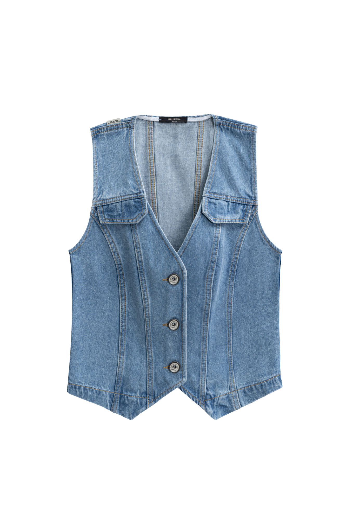Джинсовый жилет из 100% хлопка. Модель прямого кроя с V-образным вырезом горловины и объемными вертикальными швами. Застежка на три металлические кнопки. Изделие без подкладки.