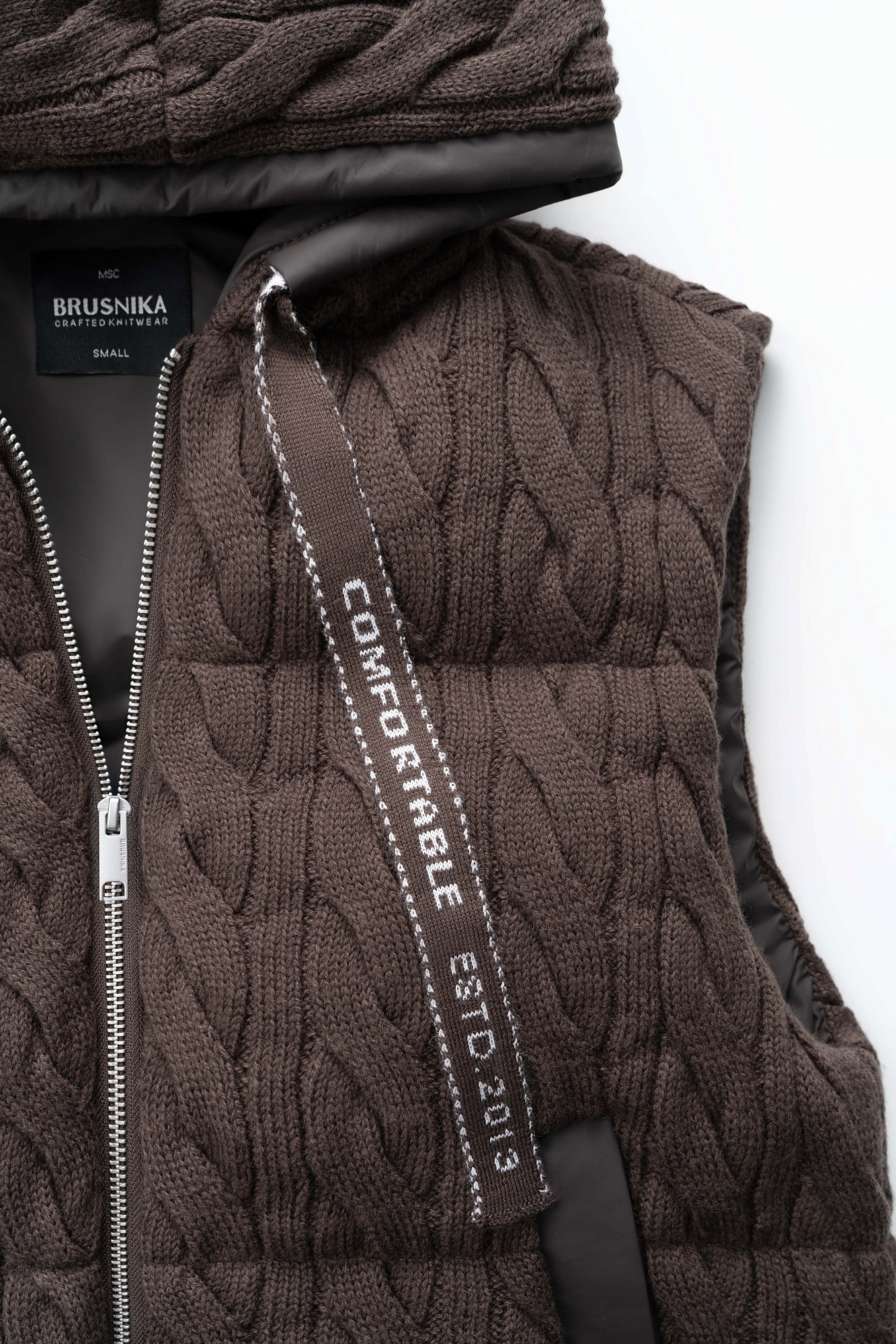 Стеганый жилет на пуху с трикотажным верхом, выполненным объемными косами из мягкой шерсти. Модель прямого кроя, с капюшоном и двумя карманами. Низ изделия выполнен на резинке. На подкладке.