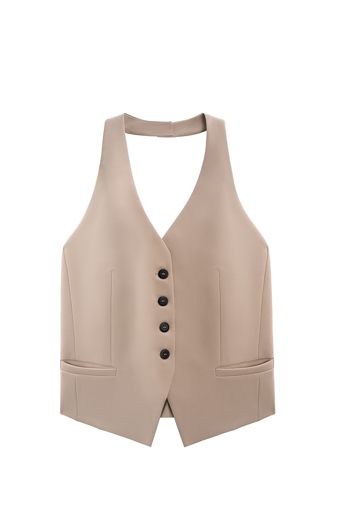 Жилет из поливискозы с открытой спиной и вырезом халтер. Модель приталенного силуэта с глубокой проймой, V-образным вырезом горловины и прорезными карманами. Застежка на пуговицы.