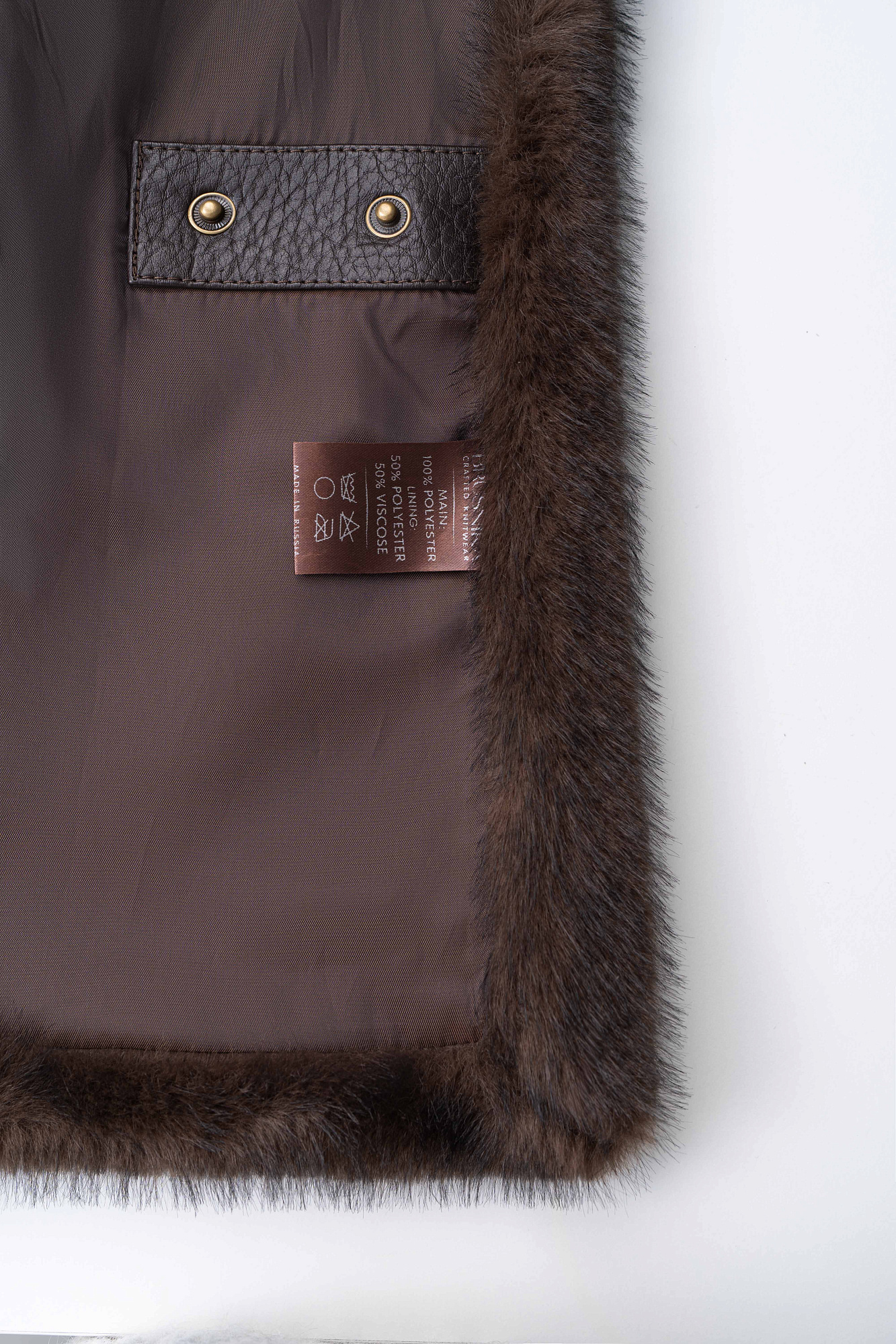 Жилет из экомеха с воротником-стойкой. Застежки по бокам на кнопки. Изделие выполнено на подкладке.